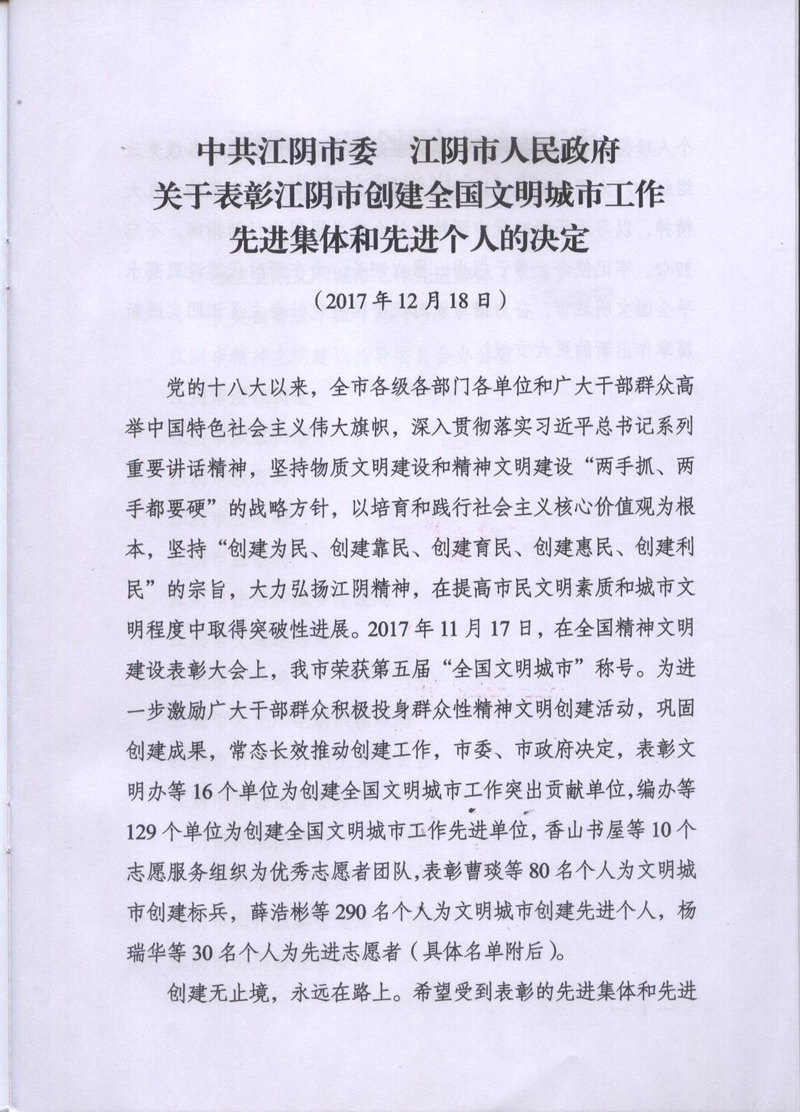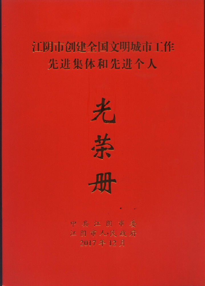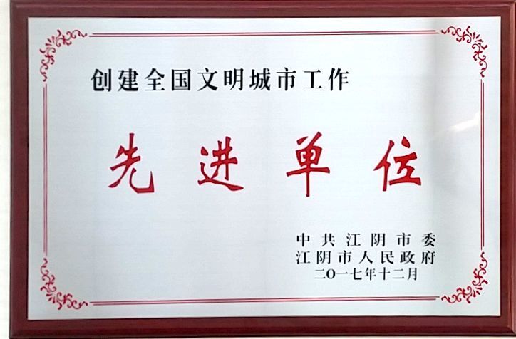 公司被評為17年江陰創(chuàng)建文明城市工作先進(jìn)集體